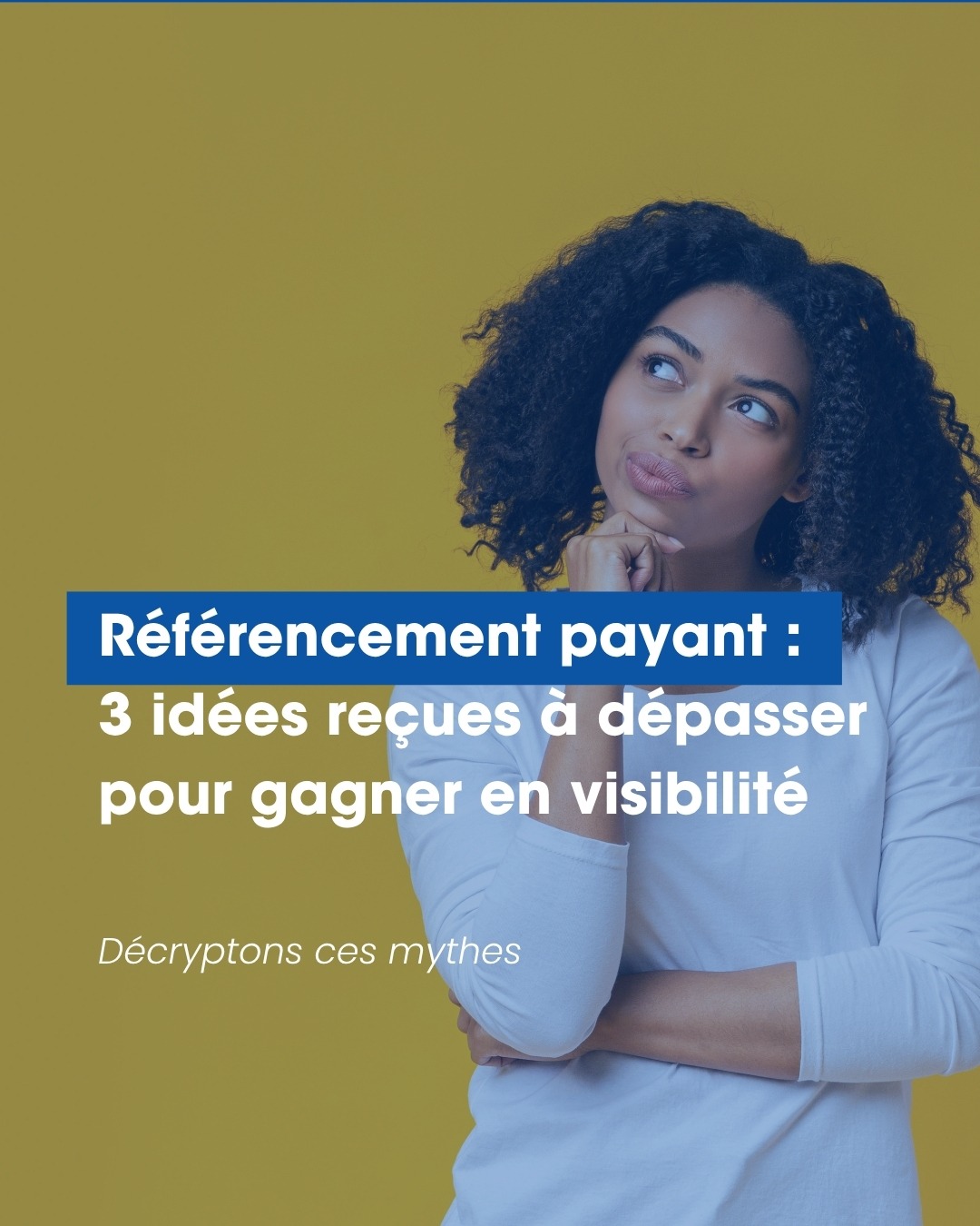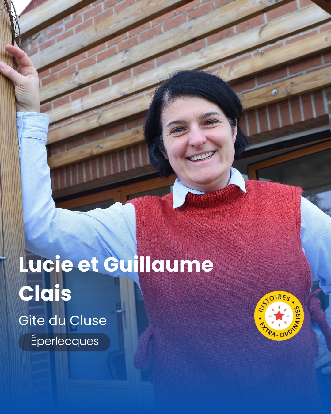 Portrait d'une jeune femme au look casual décontracté affiche un large sourire et des yeux grand ouverts tout en pointant sa gauche avec ses index quelque chose qui n'est pas dans le cadre de l'image. Une bannière de logos institutionnels habille le bas de l'image.