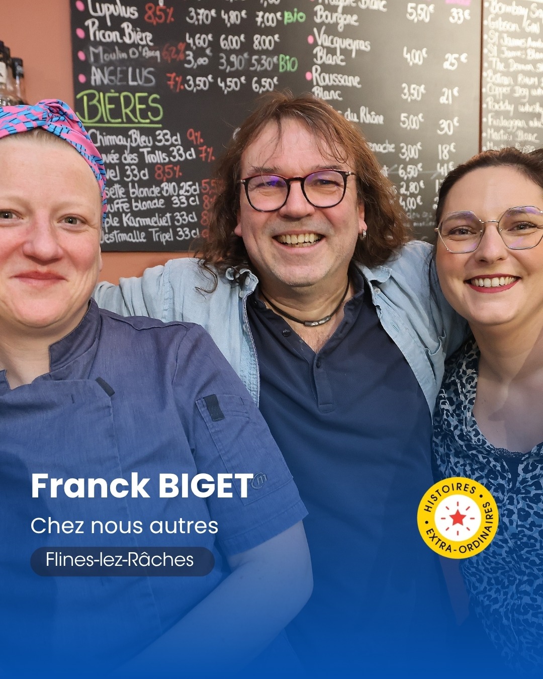 Portrait de Frédéric Leclercq, fondateur de Vélonord à Mons en Baroeul, tenant dans ses mains un cadre de vélo, et entouré par deux employés de la boutique.